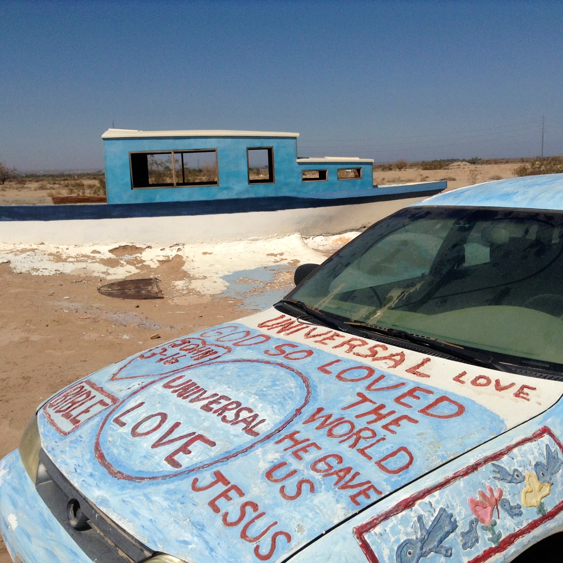 Not so far from Los Angeles….but a kindred surreal experience given the history of Salton Sea, the brilliant and disconcerting mash up of present day Palm Springs and the harsh Coachella landscape, and the lovely poignancy of this outsider artist and his legacy of love.